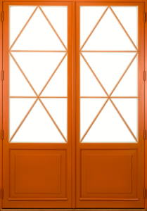 Franska dörrar är tillverkade av tätvuxen kärnfuru med hög andel kärnvirke i ytterbågar och karmens utsida. Dörrarna kittas med linoljekitt (1+1) eller Lasealkitt och har en tröskel i ek. Både insida och utsida kan ha en frisad äkta spegel i fuktfast MDF eller en smal stående panel med droppnäsa. Spröjsen är tunna (22 mm) och finns i två tidstypiska utföranden: sekelskiftestyp eller kvartsstavsformad spröjs från 20 & 30-talet.